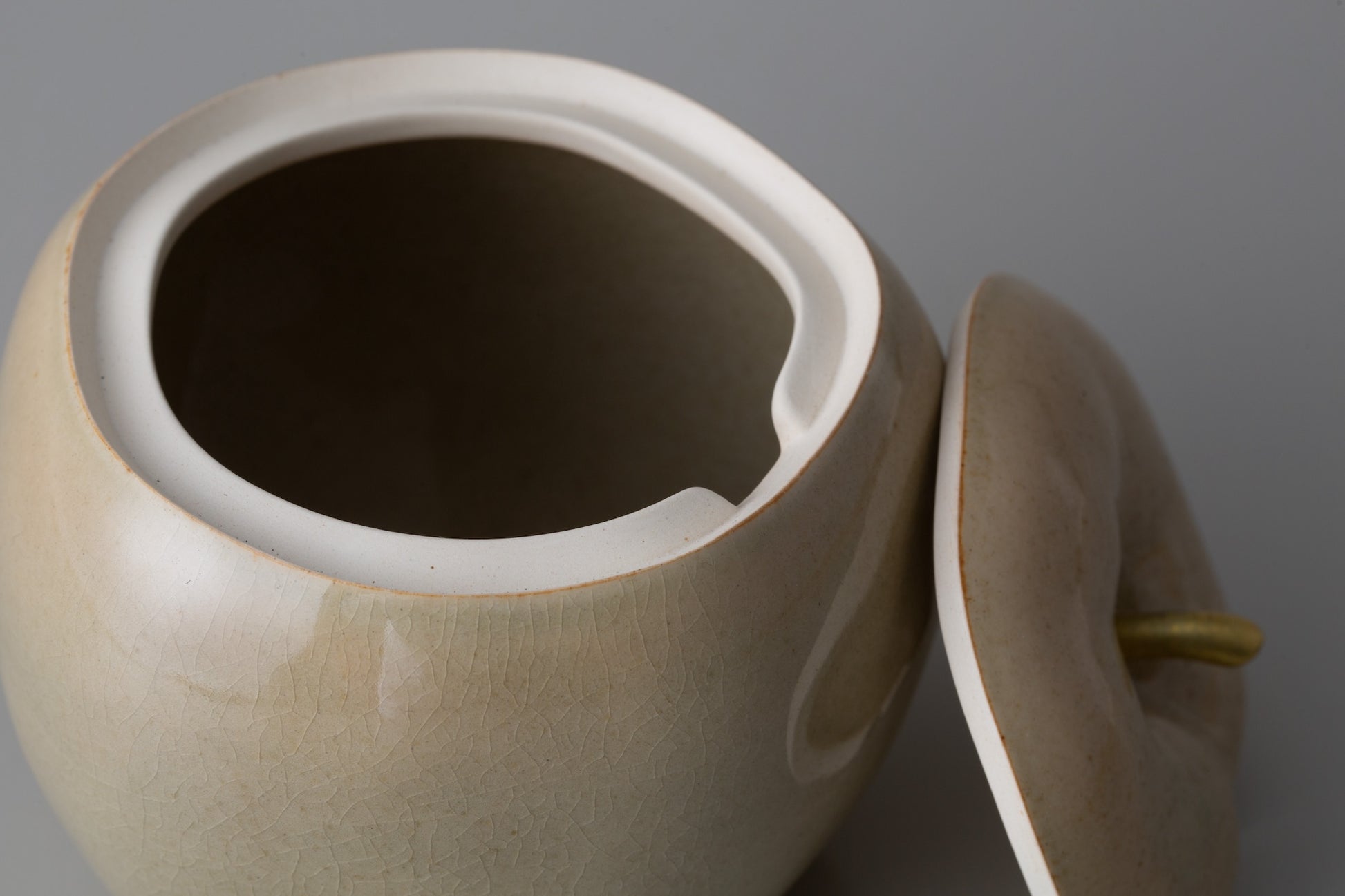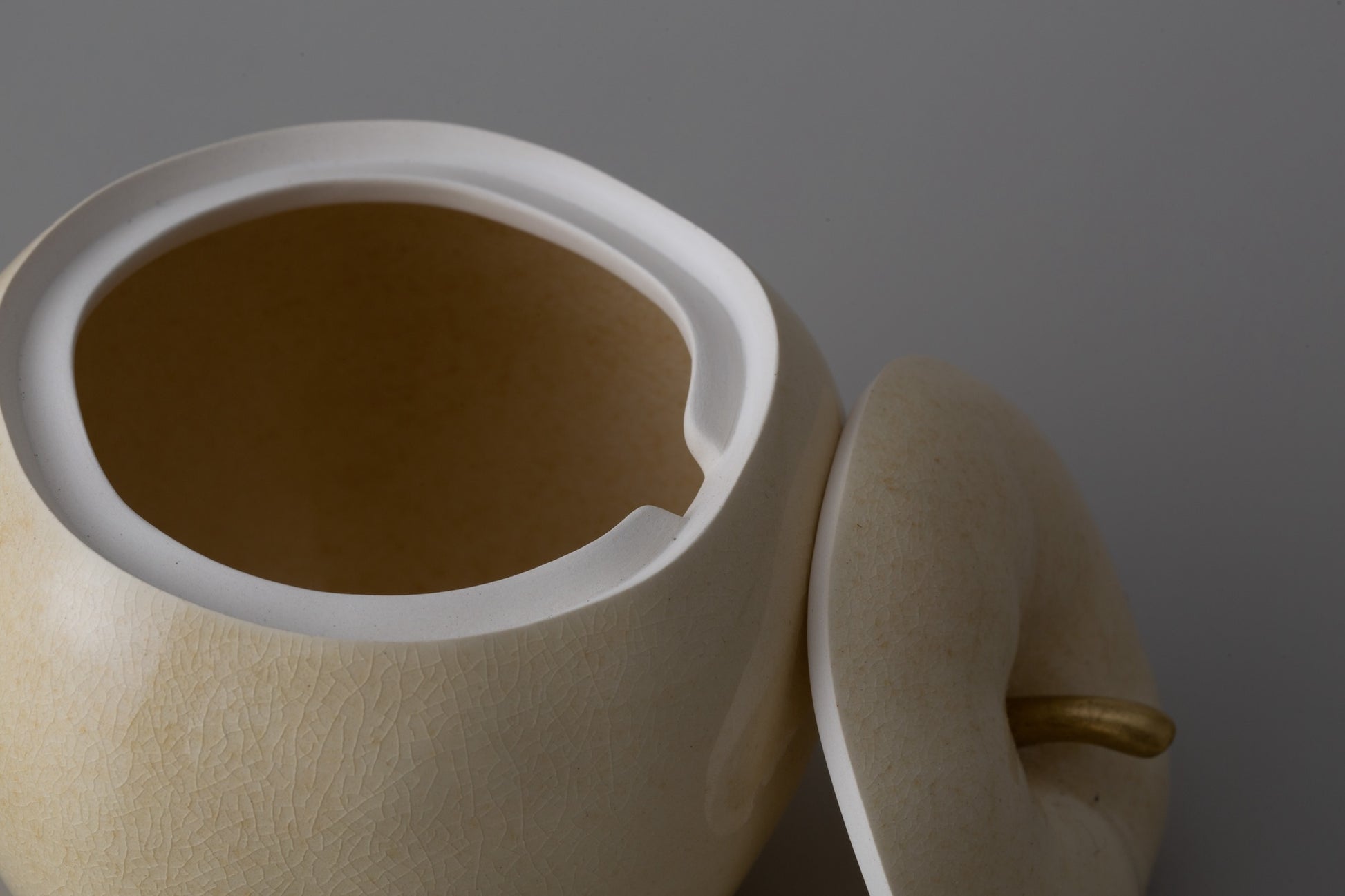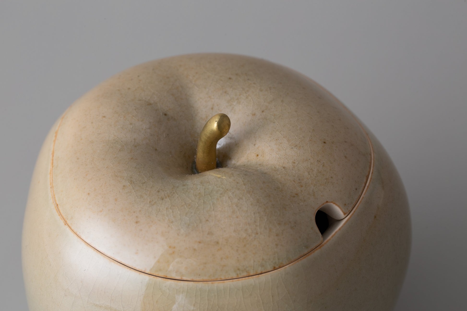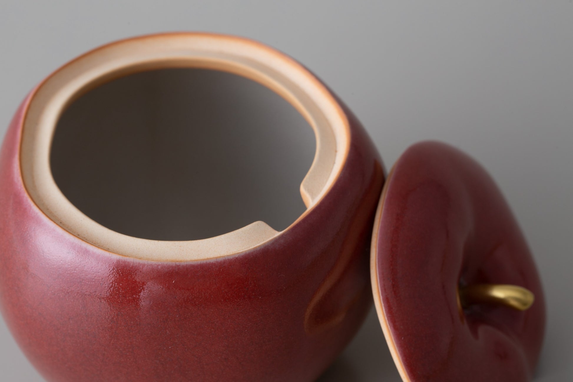 鹿児島県の沈壽官窯と共同でスタートをしたCHIN JUKAN POTTERYの シュガーポットです。鹿児島の風土に根付いた世界に誇れる巧みな 職人たちの技術と新しい発想により、新しいサツマウェアーとして 製作されたアイテムです。本物のリンゴから型を取ったように見えるほど、リアル なフォルムと今までの薩摩焼にはない絶妙な色の釉薬が特徴です。