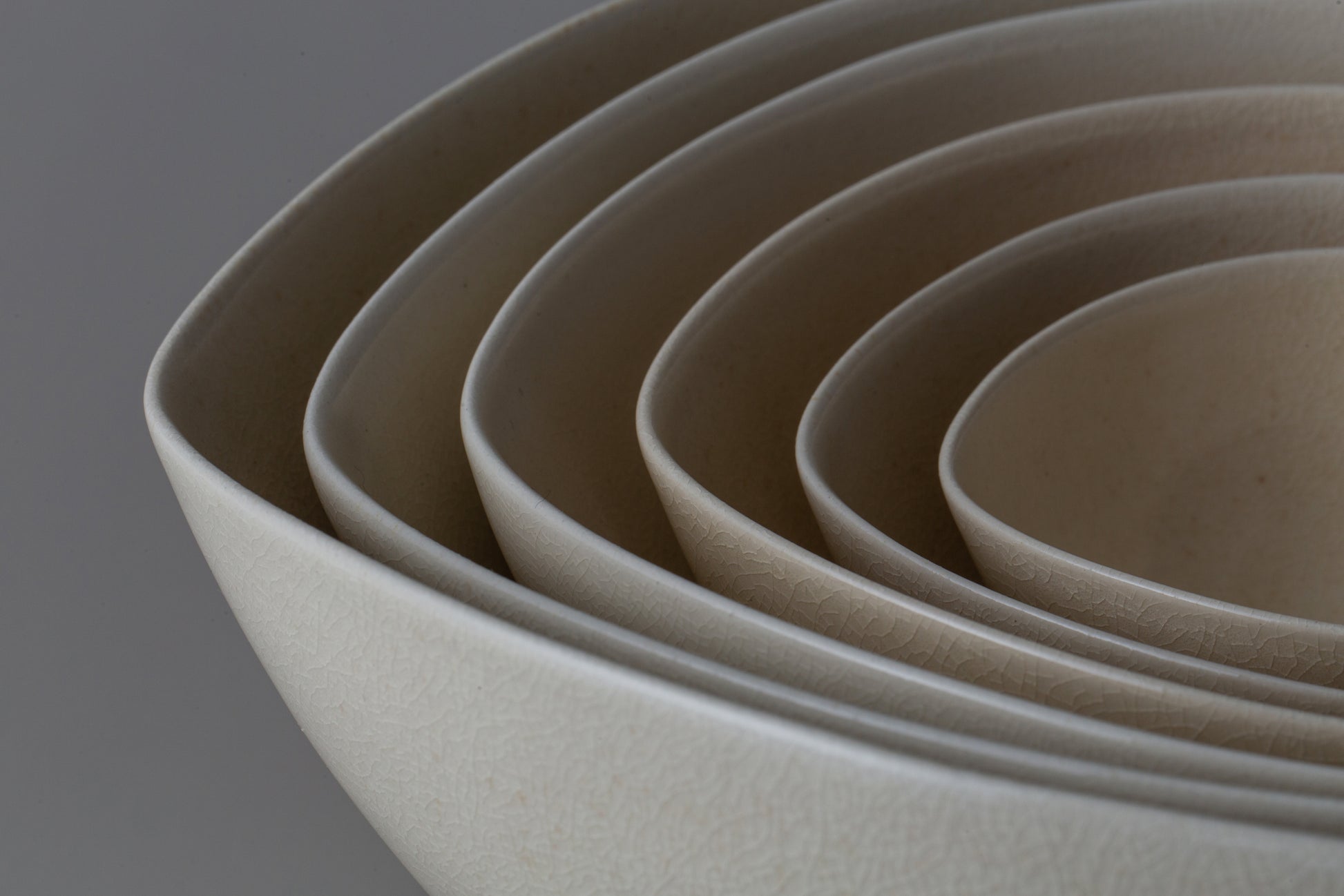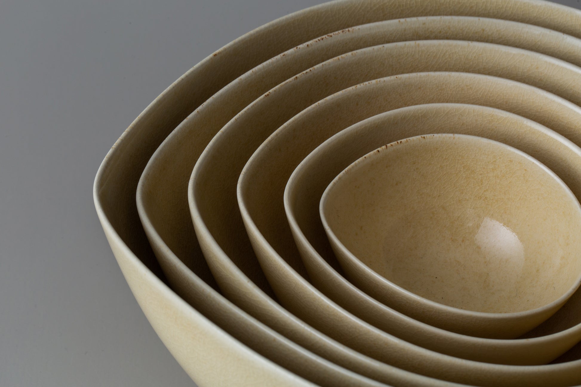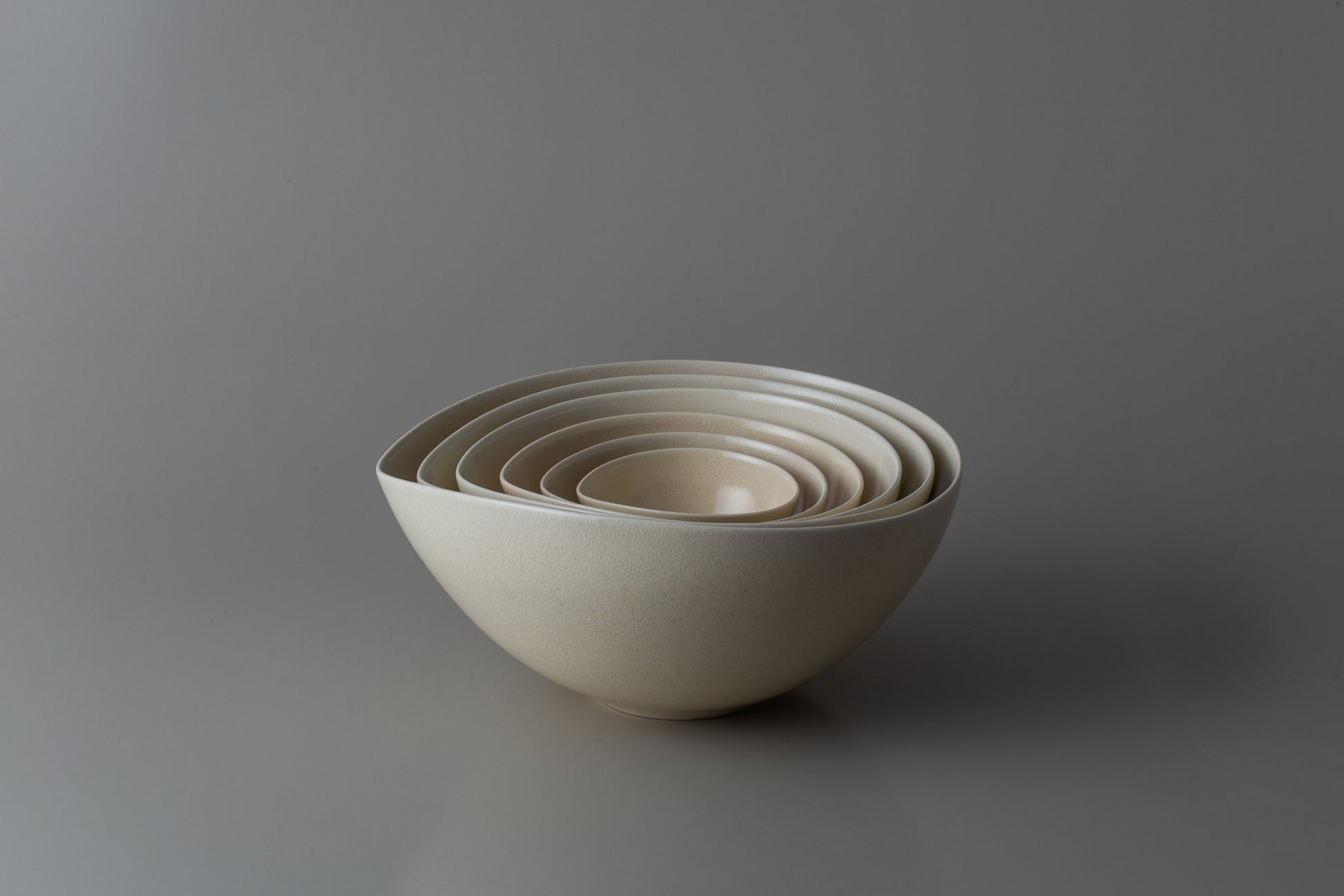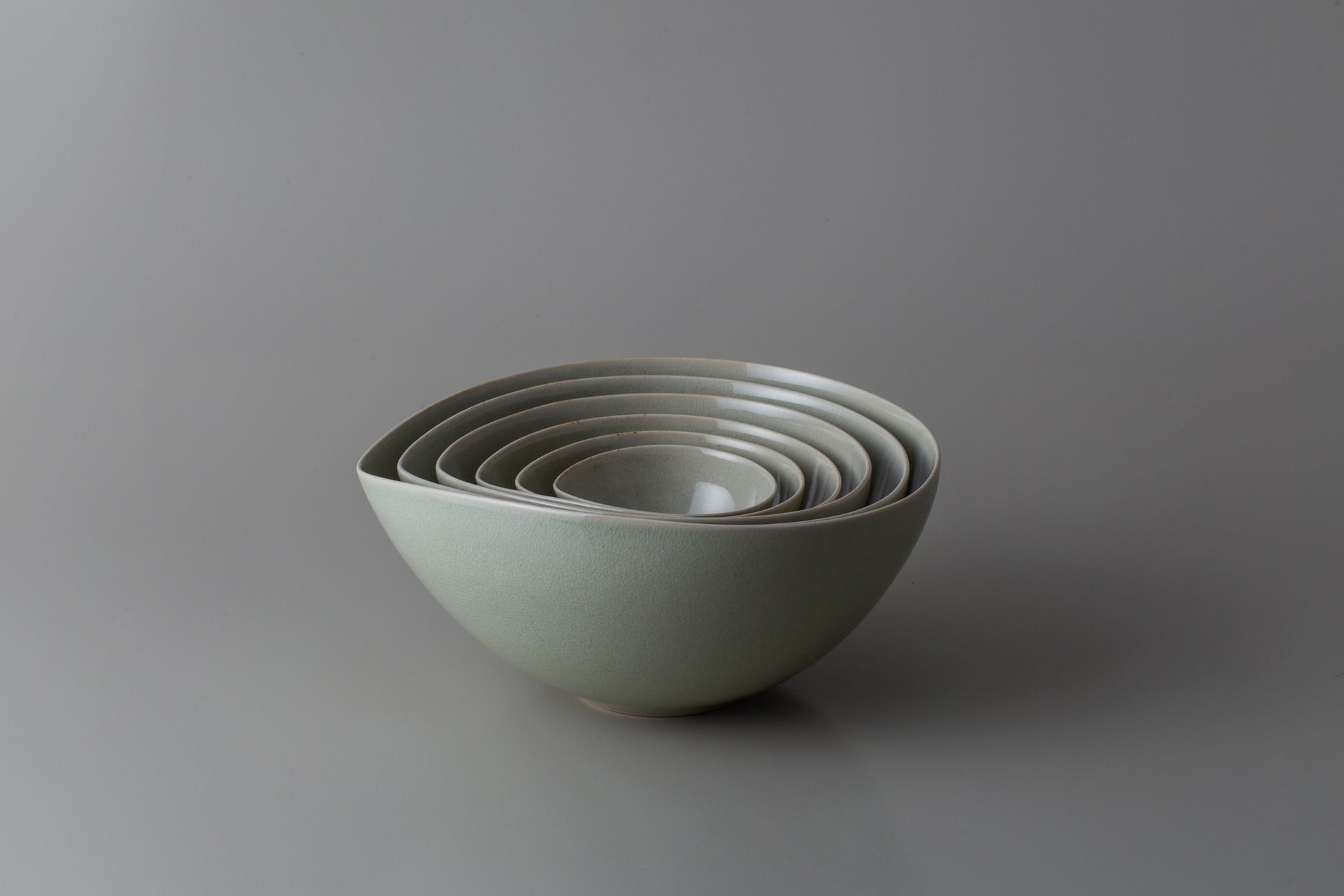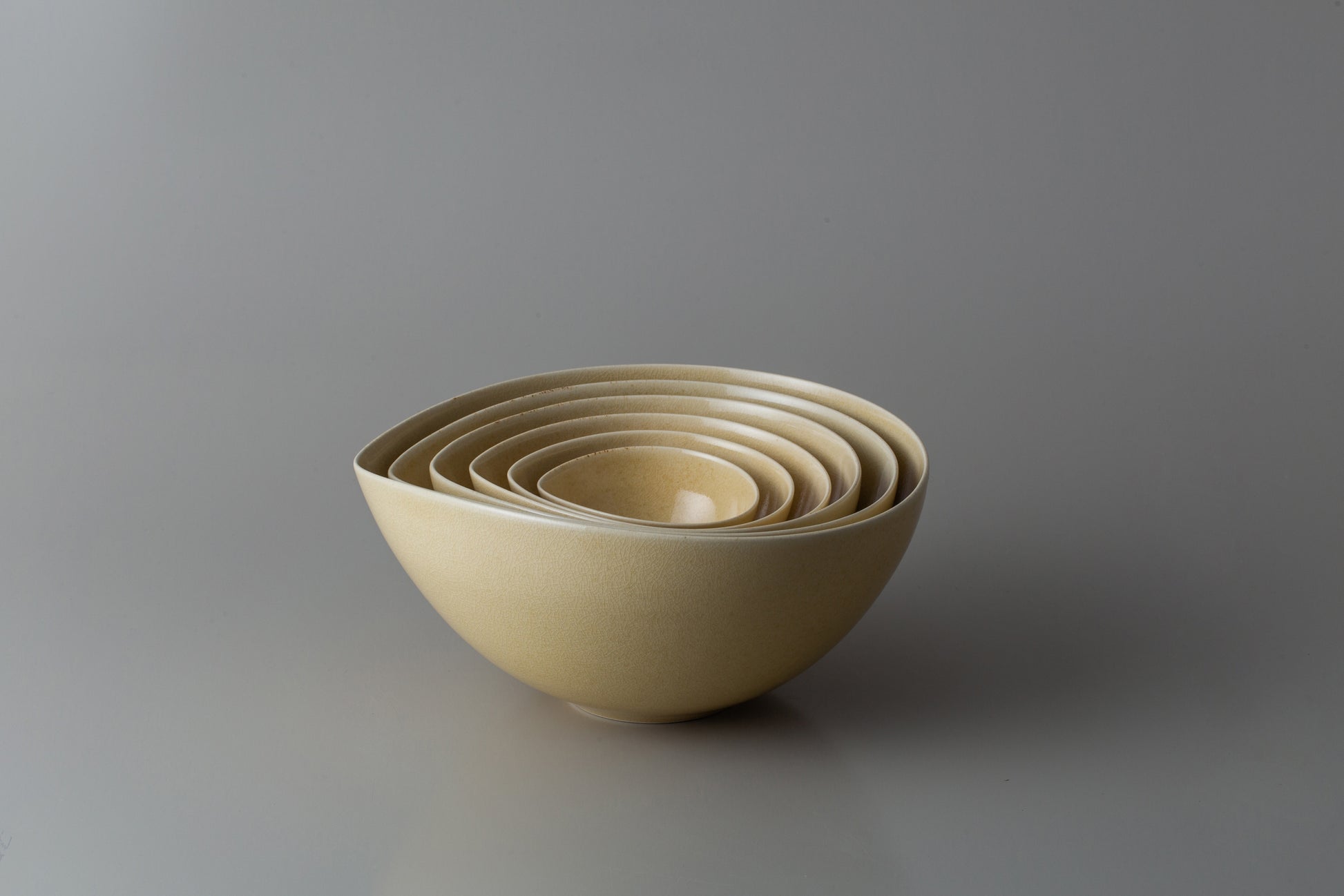 大小様々な用途にお使いいただける器は入れ子に納められるので、見た目にも美しく無駄な装飾の無いシンプルなデザインとなっています。薩摩焼ならではの繊細な釉貫入と共にお楽しみください。