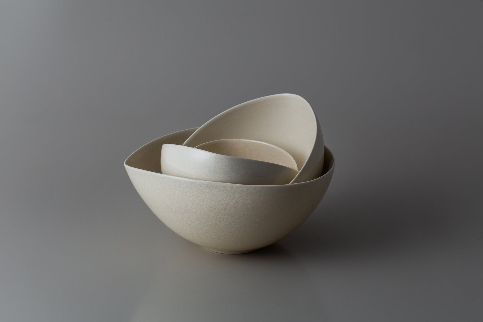 Bloomは、花のつぼみをモチーフにした作品です。ロクロ成形したボウルの形を掌で少しずつ変形し、内側がよりやわらかい容(かたち)になるよう仕上げました。
