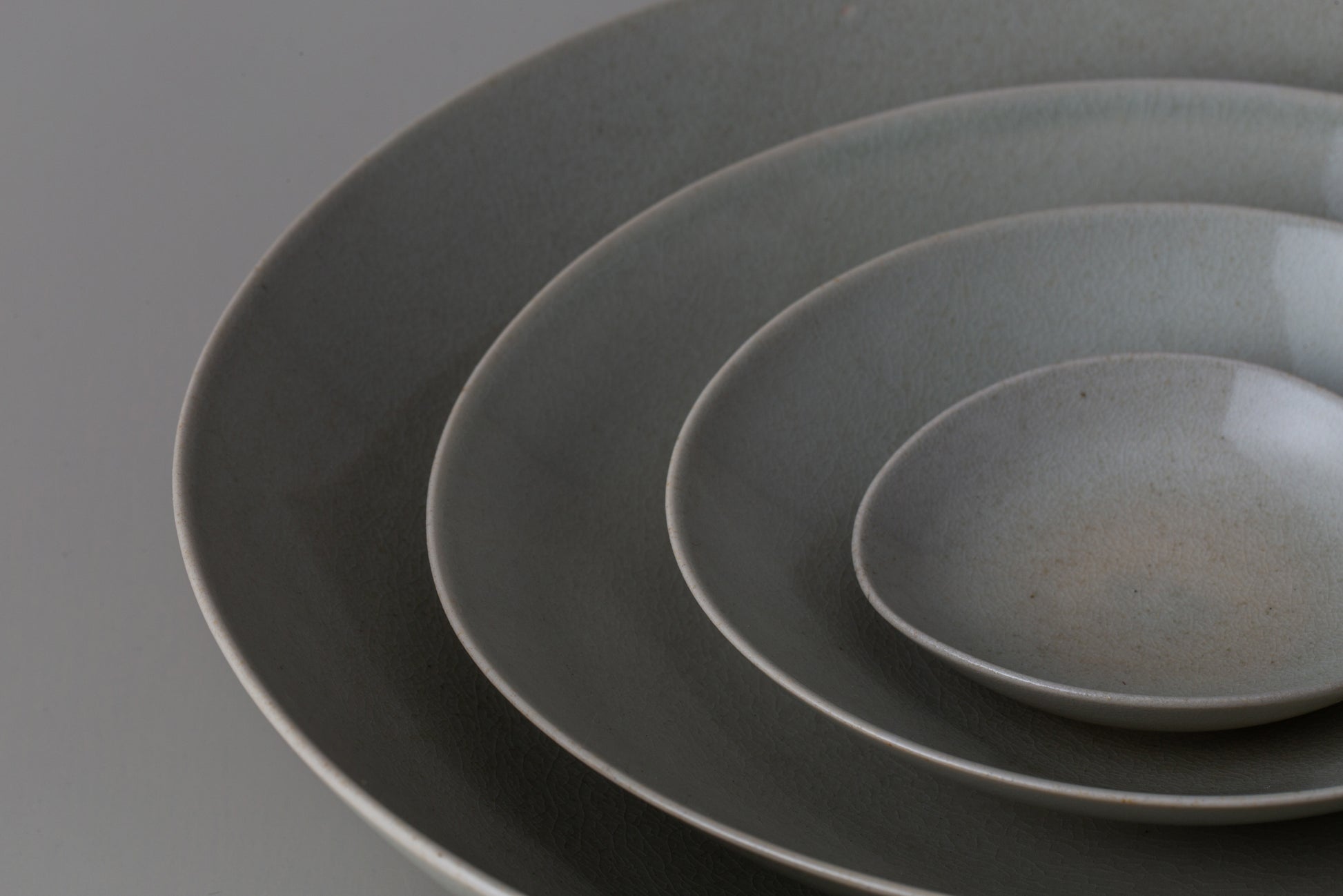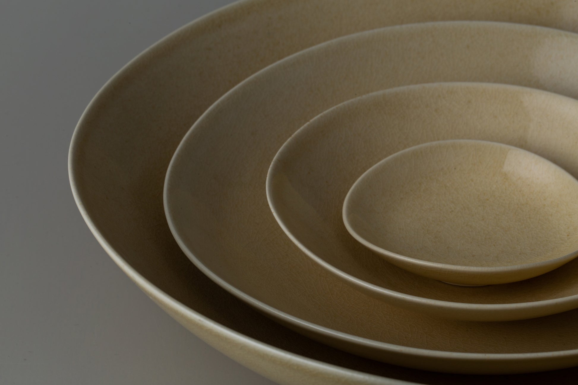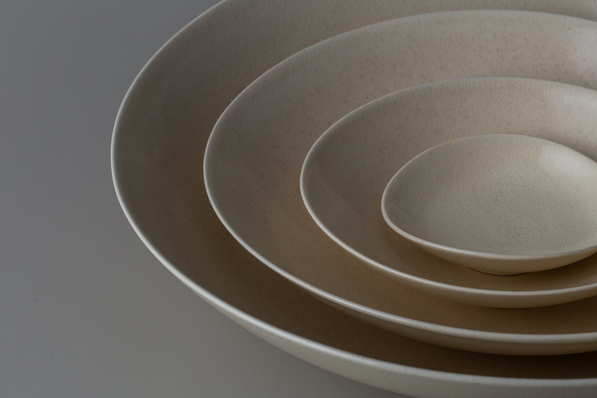 Pearlは、小さな宝珠を内包する貝殻のイメージで創りました。土の塊をロクロの上で最大限ひきのばすようにして作った薄手の器は、自然な楕円形を描いて焼きあがっています。 大きさに4種類のバリエーションがあり、それぞれ小皿や冷酒の杯として、汁ものやカレーなどの銘々皿として、またはパスタやサラダなどオードブルを盛る器としてお使いいただけます。
