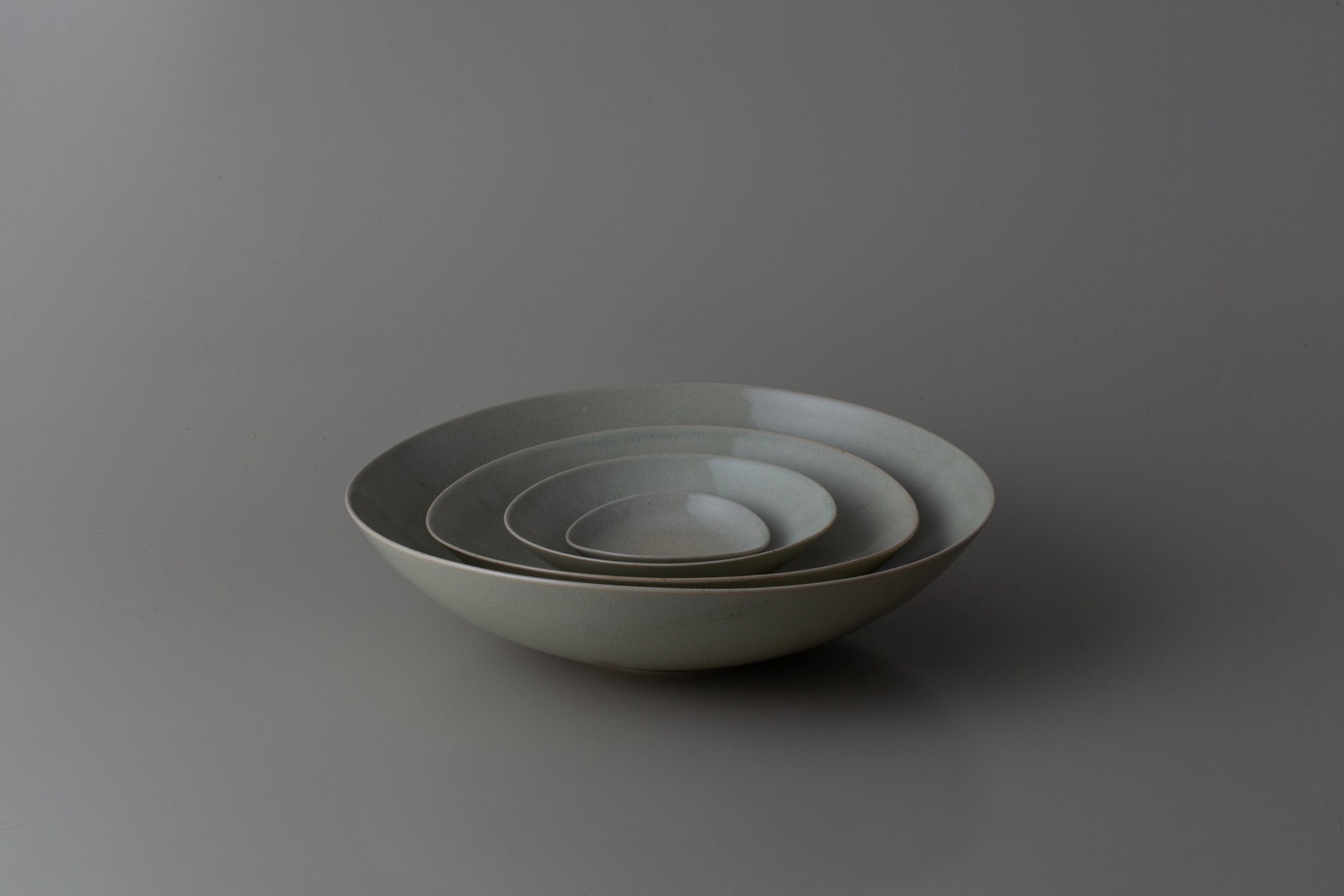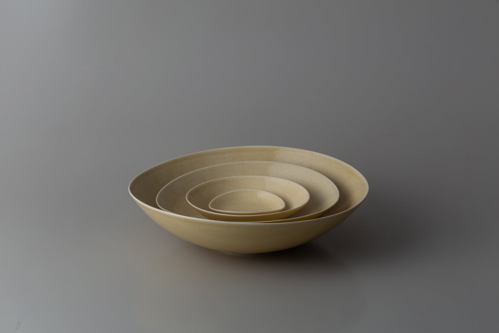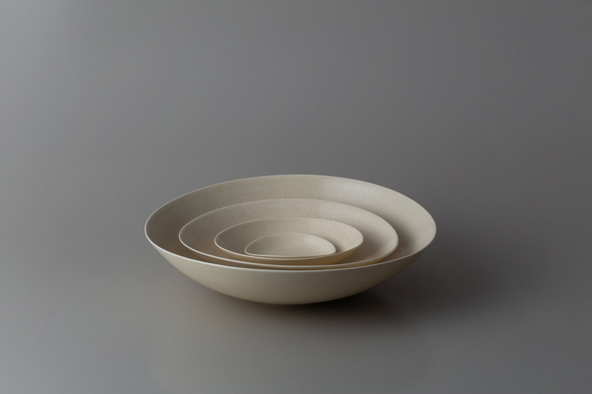 Pearlは、小さな宝珠を内包する貝殻のイメージで創りました。土の塊をロクロの上で最大限ひきのばすようにして作った薄手の器は、自然な楕円形を描いて焼きあがっています。 大きさに4種類のバリエーションがあり、それぞれ小皿や冷酒の杯として、汁ものやカレーなどの銘々皿として、またはパスタやサラダなどオードブルを盛る器としてお使いいただけます。