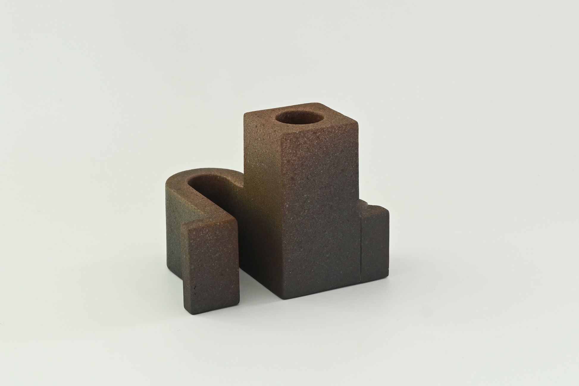 陶磁器とは思えない精巧な造形は、まず押し出し成形によって円筒、建築物の様々なディテールからインスピレーションを受けたかたちのパーツを作り、それらを組み合わせることによって制作されています。