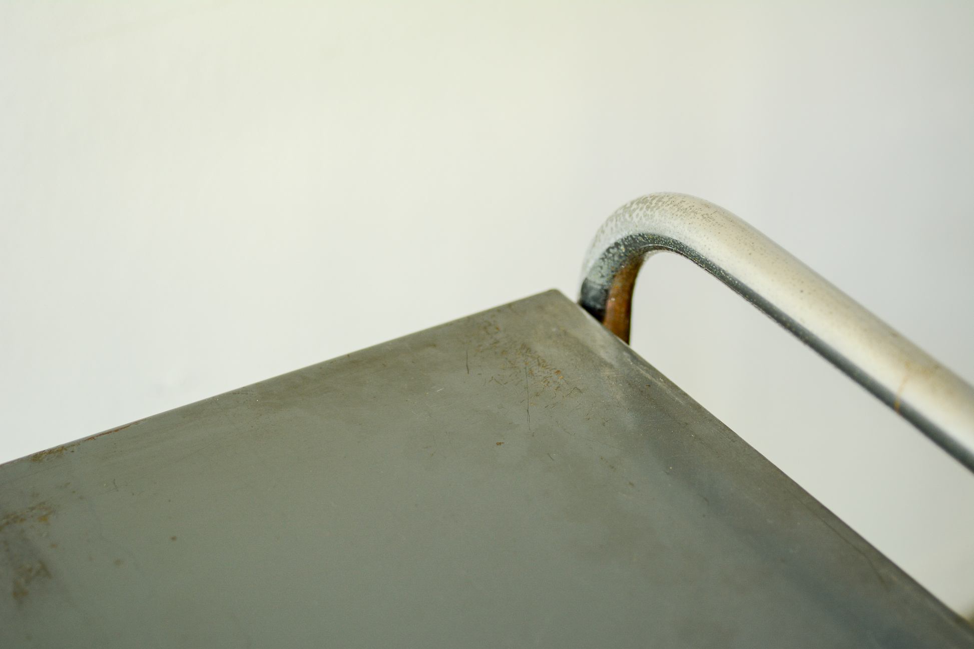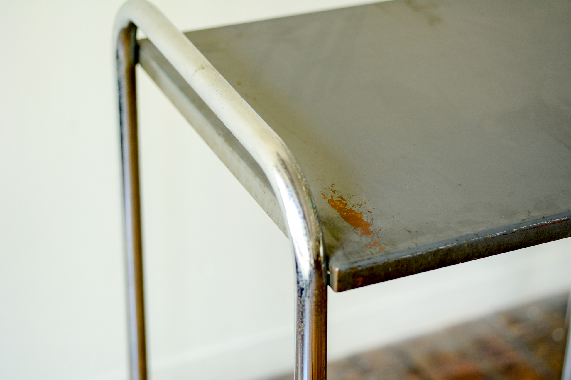 ヴィンテージのサイドテーブルです。スチールパイプが一つの線で繋がったデザイン。グレーのスチール天板とステンレス足の相性がよく、部屋の隅やデスク横に収まります