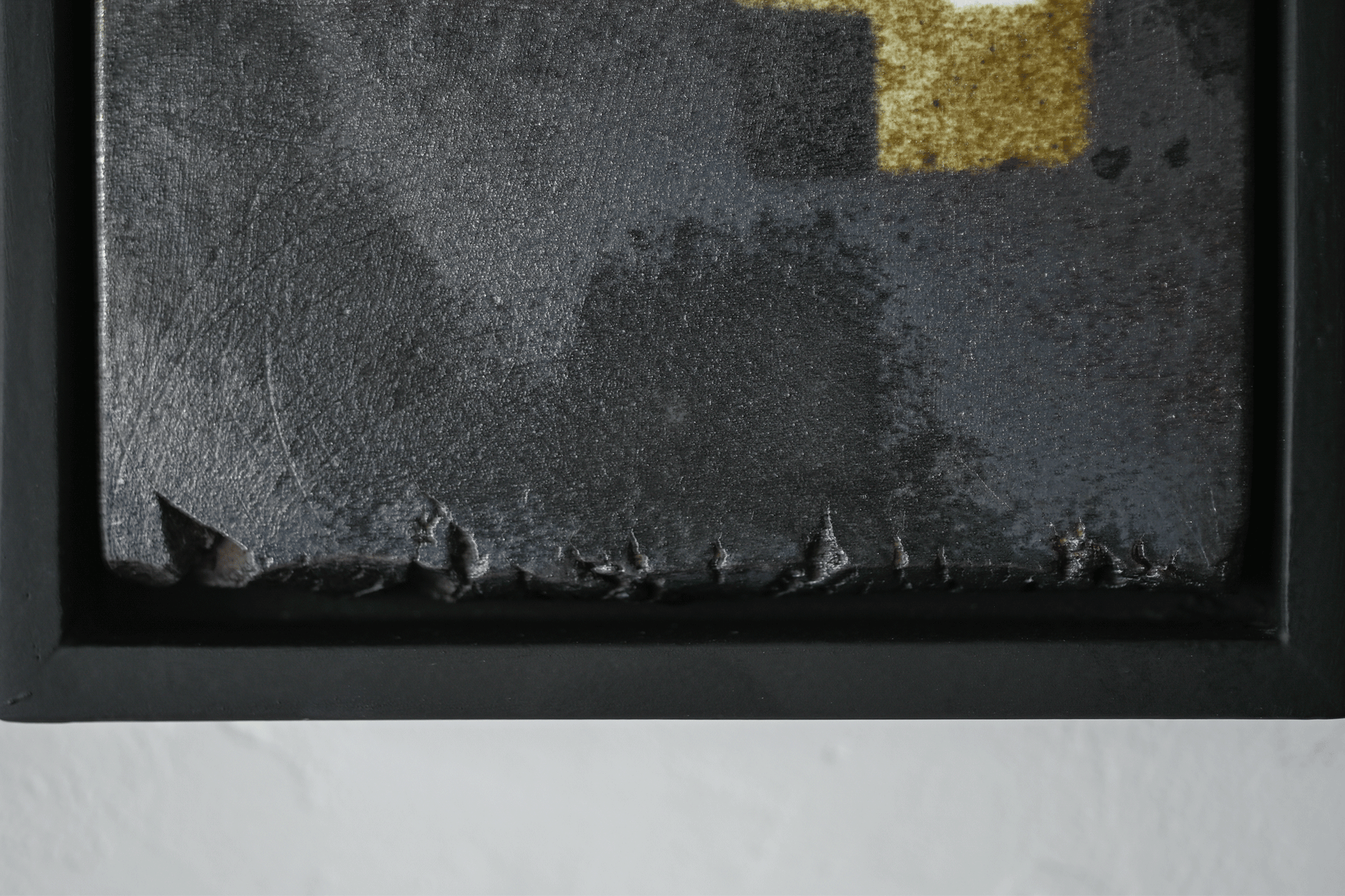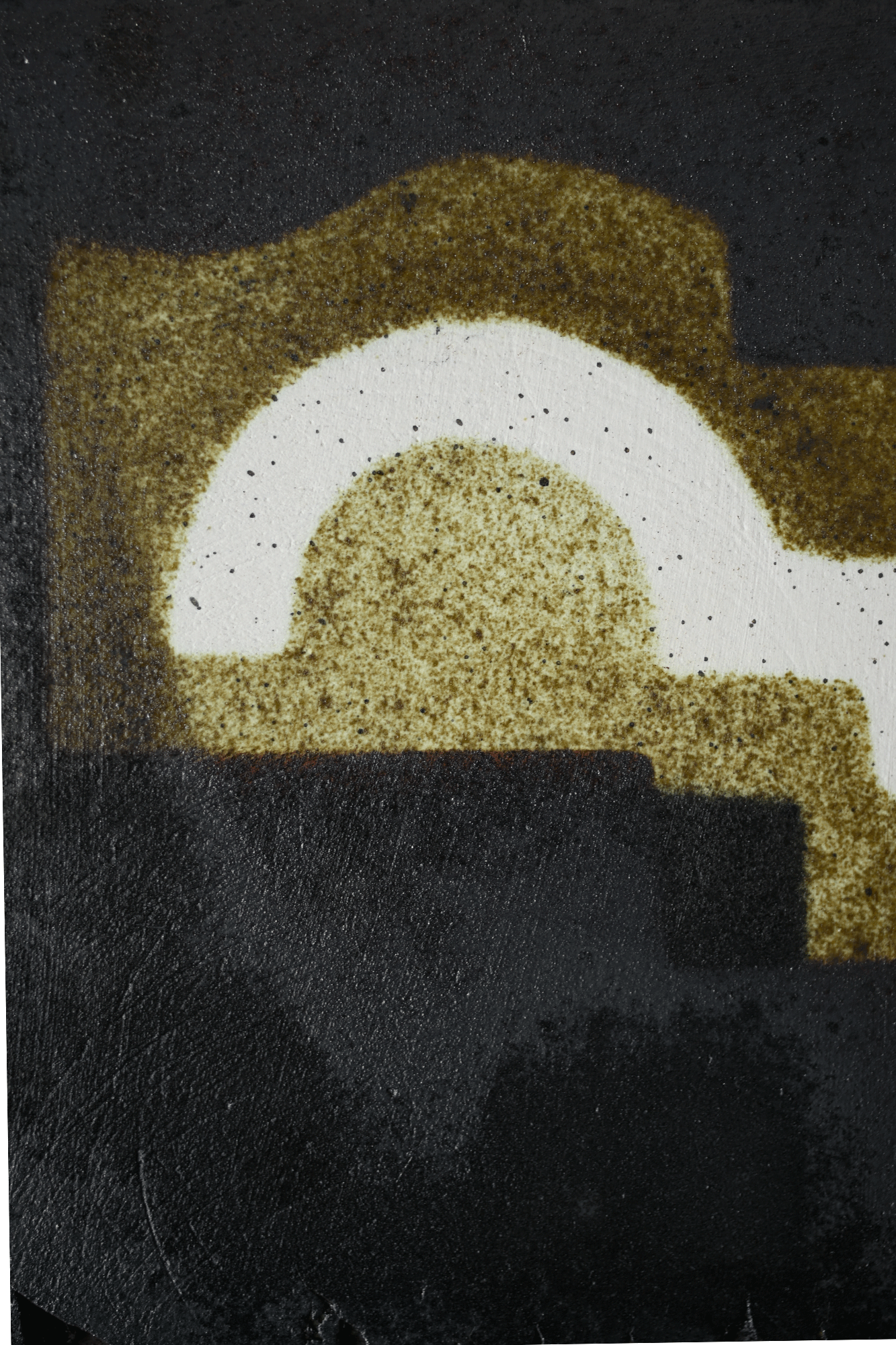 釉薬と幾何学的な造形のレイヤーが生み出す色のグラデーションやコントラストが美しい作品です。