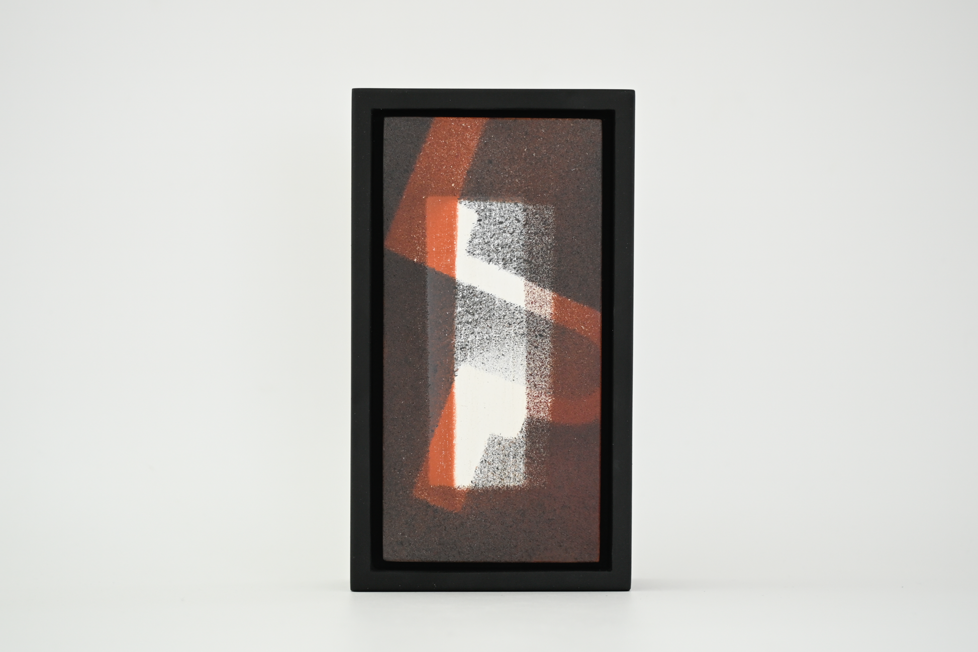 釉薬と幾何学的な造形のレイヤーが生み出す色のグラデーションやコントラストが美しい作品です。