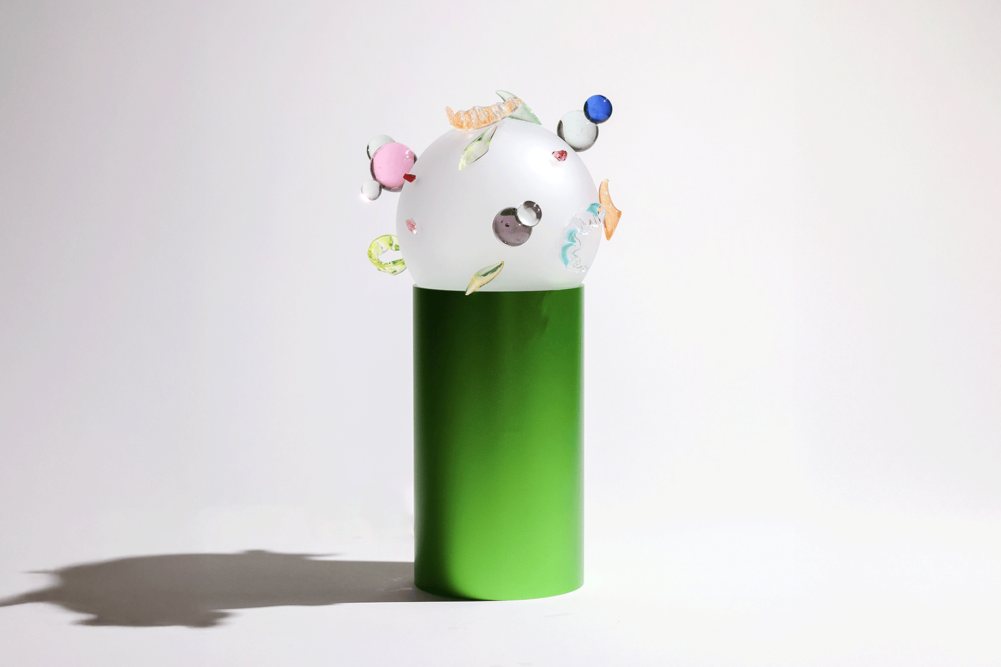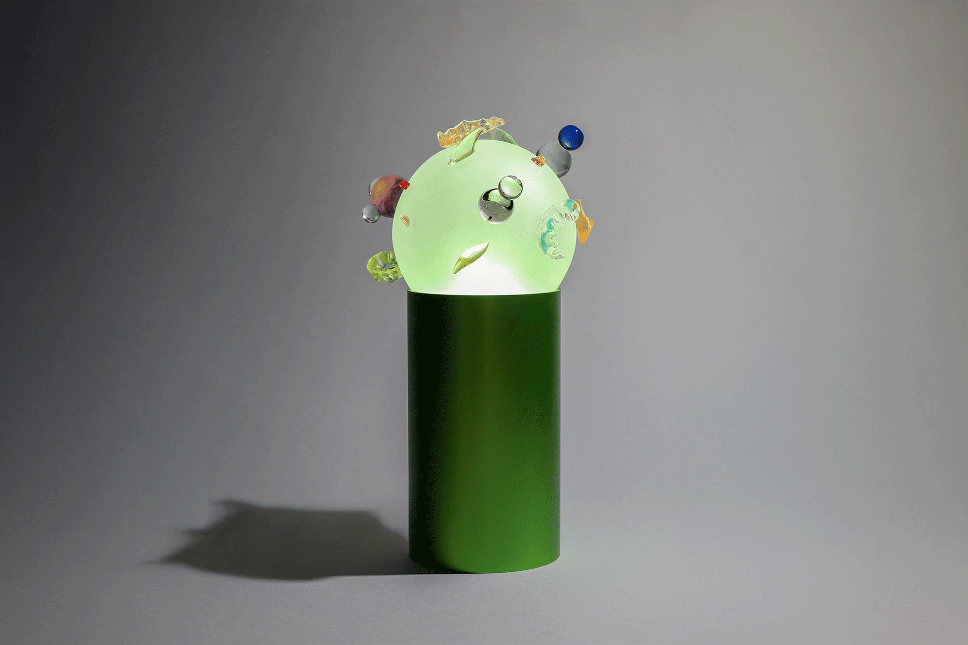 福岡を拠点に活動するガラス作家和田朋子さんの作品です。色とりどりのガラスのパーツを組み合わせた照明は、照明というよりも発光するオブジェの感覚です。光を灯さない昼と光を灯す夜とで形や素材の印象が変わるのが照明の面白いところ。1日を通しての変化をお楽しみください。